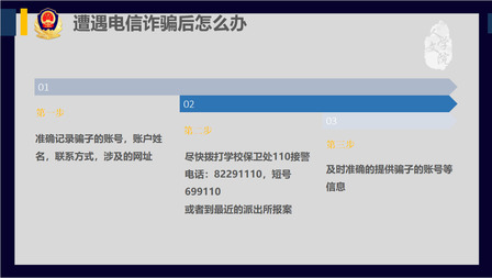 “遭遇电信诈骗后,要准确记录诈骗分子的账号、账户姓名、联系方式和涉及的网址,尽快拨打学校保卫处110接警电话,或者到最近的派出所报案。”池方婷指出。