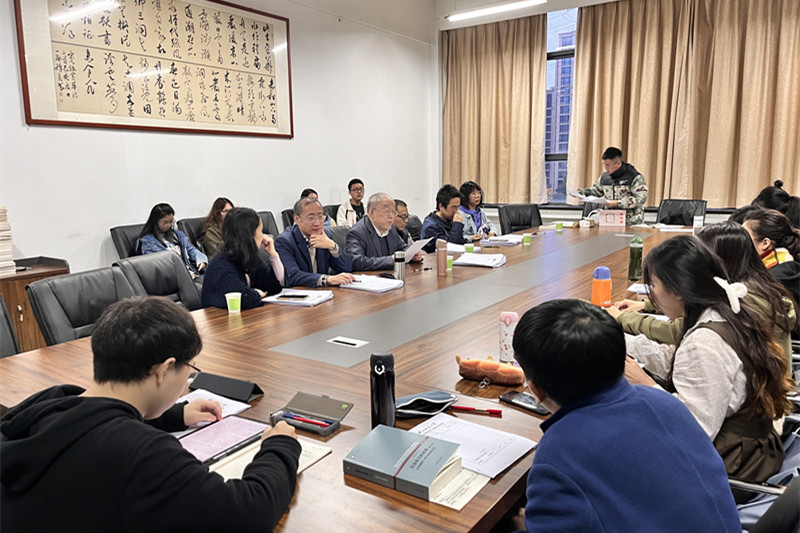 会上,同学们就各自报告内容进行阐述。在场老师认真听取学生汇报,并从选题对象、论文结构、行文逻辑等角度提出切实扼要的建议。其中,陈羿江汇报了《金圣叹叙事学的作品理论研究——以〈水浒传〉评点为核心》一文,考核组老师指出应明确论文重心并加以创新,同时应尝试融入自己的观点。