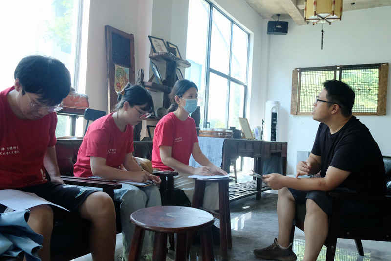 7月13日下午,实践队队员们在前期调研的基础上,围绕木版年画的传承及保护等话题,对金华市木版年画博物馆馆长黄晨进行采访。黄晨馆长介绍了博物馆的历史及发展现状,近年来,博物馆通过创新性地解构传统内容、推出年画礼盒、开发APP、与网易等网络公司合作等举措,将时代活力注入木版年画。谈及木版年画的意义,他表示:“木版年画不仅仅是一项非遗技艺,也不仅仅作为一种呈现手段。它的核心是所呈现的内容,我们传统文化中的民族美德与民间风俗通过一种造型艺术创造出来,表现为图形,再通过非遗技艺传播。这是我们理解木版年画的三个层次。”