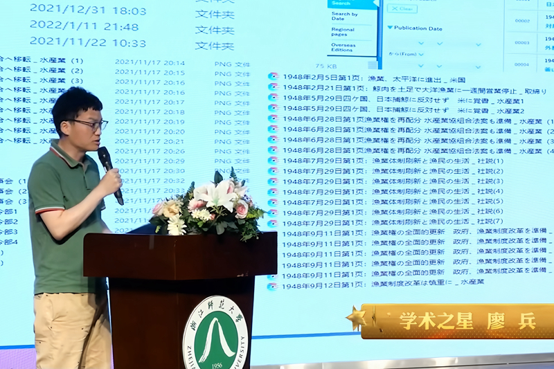 勤于治学,勇于攀登。司马迁之“究天人之际,通古今之变,成一家之言”,一语道出研究史学的真谛。廖兵的学术之路,开始于高中时期对历史学萌生的浓厚兴趣。历史长河的纷纷扰扰、光怪陆离,激起了他探索真相的求知之欲。他认为,作为学术青椒,在爬坡阶段,不断学习前人的治学之道至关重要。他每天坚持阅读精品C刊文章,学习学术论文的写作方法。此外,积极参加学术会议,与知名学者交流互动。其撰写的《二战后日本的渔区扩张与麦克阿瑟线撤废活动》,已顺利刊登于中国史学科世界史方向的顶级期刊《世界历史》上。这是我校培养中国史博士研究生以来,学生首次以第一作者身份在权威期刊上发表论文,是浙江师范大学历史学研究生教育的一项重要突破。