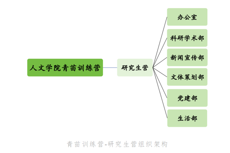 青训营设研究生营与本科生营。研究生营下设研究生会青训队;本科生营下设学生会青训队、团务中心青训队、社团管理委员会青训队、党员之家青训队、融媒体中心青训队五大团队,各青训队再下设中心、部门。营员可按照个人兴趣自愿报名并通过面试考核进入各青训队。营员拥有协助各团队相关工作与活动的权利与义务,能够通过实践锻炼责任感与行动力。