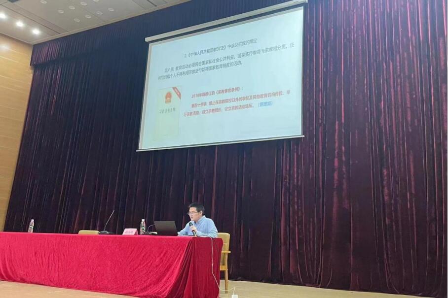 讲座伊始,陈海峰从马克思主义宗教观教育、考风考纪教育、心理健康三个方面展开讲解。就宗教方面,他以“大学生怎样正确认识和对待宗教”这一问题切入,介绍了有关宗教的法律法规,引导学生们树立正确的马克思主义宗教观。