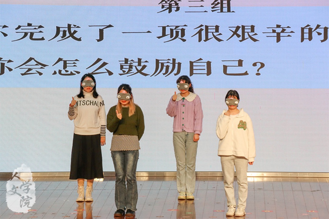 在第一个环节“情同手足”中,“睡觉少女特工队”按要求带上眼罩,根据主持人给出的提示做出相应的动作。被问及“若要完成一项很艰辛的任务,你会怎么鼓励自己?”时,她们不约而同地竖起了大拇指。朝夕相处中培养出的默契,帮助她们轻松通过考验,展现出我院和谐友好的寝室氛围。