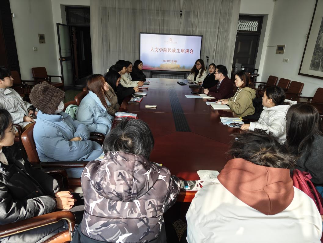 1月3日中午,我院在24幢四楼学院会议室召开民族学生座谈会。学院党委副书记陈海峰、学工办主任赵凯莉、学工办老师蔡霜和20余名民族学生参加座谈会。