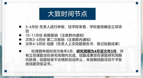 最后,主持人讲解了校课题研究的流程与注意事项,包括课题申报要求、选题要求、前期申报流程以及项目的结题与终止,使同学们对于校课题有进一步的认识。