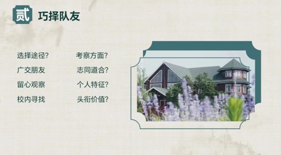 安琪就选题、组队及完成选题三方面进行分享。她提出选题的技巧,例如查找往期项目、结合个人情况、多方寻求帮助。然后,安琪就选择队友这一问题分享其个人的经验,为同学们提供一些成员选择的途径,比如观察个人特征、扩展社交范围、关注头衔价值等。最后,安琪强调校课题研究应按部就班地在规定时间内完成,并提前与老师取得联系。