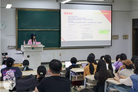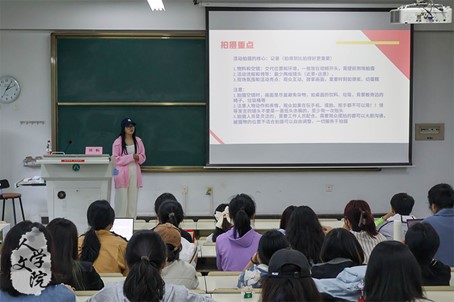 在讲解正式拍摄板块时,刘畅结合校融通社往期优秀作品,向与会同学介绍空镜、特写、远景等拍摄手法。她提示在拍摄活动初始可运用空镜拍摄活动海报,运用特写拍摄活动人员进场,充分营造活动氛围。联系自身实践,刘畅提醒与会同学尽可能多机位拍摄活动,用以应对突发状况。