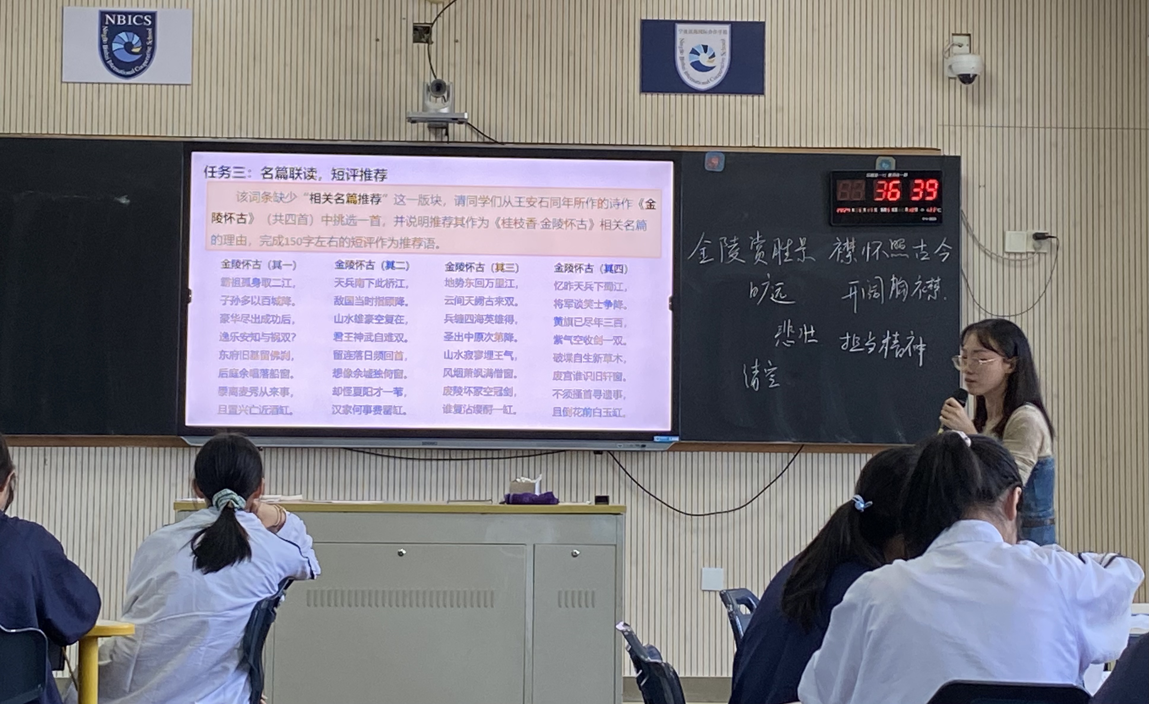 余盼怡老师从《桂枝香》词条条目切入,带来《金陵赏盛景,襟怀照古今——〈桂枝香·金陵怀古〉与〈金陵怀古〉联读》一课。通过意象手绘、文献补充、名篇联读,将古诗文字图像化、情境化,引导学生斟酌字词释义,理解用典深意,体会诗人情感。