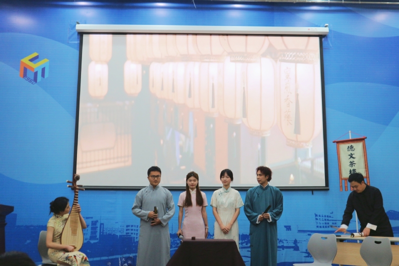 在现场评比大会上,我院研会以“青苗撷光传国韵,笔墨共书启今朝”为主题,结合茶楼元素,采用古人评书弹唱的传统特色形式,对本学年工作进行总结汇报。为了更好地彰显人文风采,研会精心制作手摇扇、帆布袋等成果辅助展示。