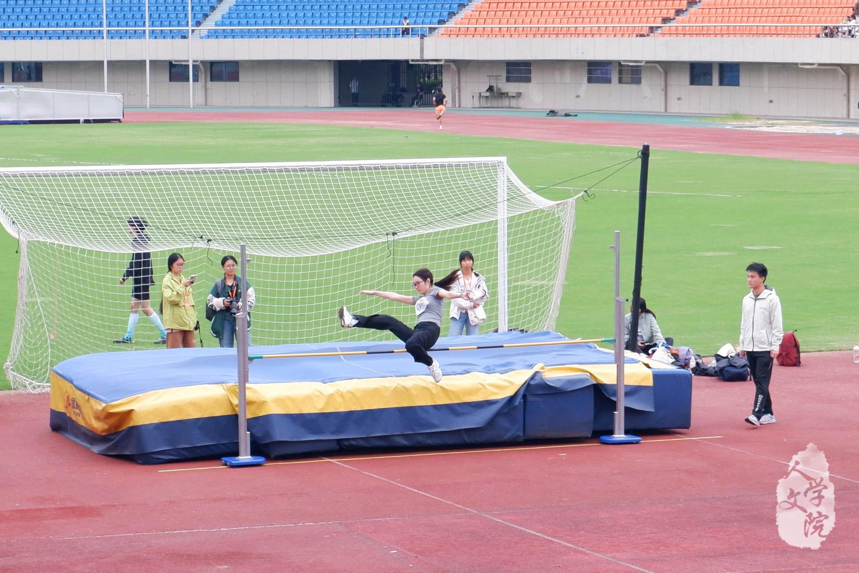 10月24日下午,女子跳高决赛在我校东田径场展开激烈角逐,汉语言文学2309班葛思怡代表人文学院参赛。