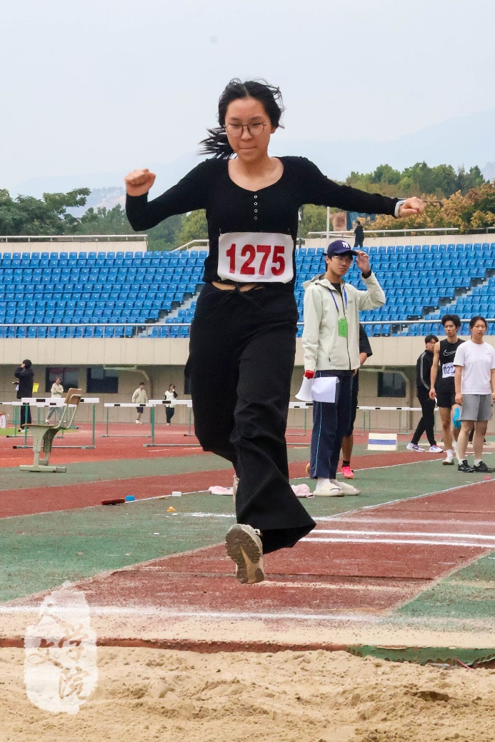 10月25日下午,女子甲组三级跳远决赛在东田径场举行。历史学2502班潘佳楠代表人文学院参赛。