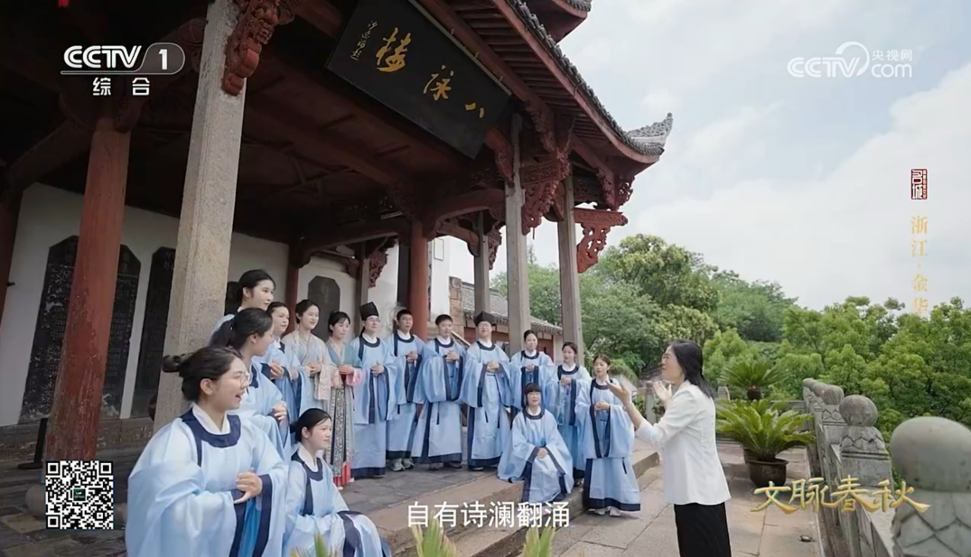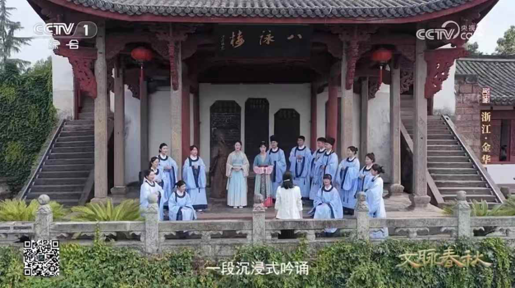 “千古风流八咏楼,江山留与后人愁……”近日,伴随着清越吟诵声在八咏楼前再次响起,浙江师范大学人文学院赵瑶丹老师与学子们的身影亮相央视大型系列纪录片《文脉春秋·金华》开篇。这部由中央广播电视总台与金华住房和城乡建设局联合摄制的纪录片,以30分钟篇幅全景展现金华文脉,于10月28日在央视综合频道播出。赵瑶丹师生以沉浸式吟诵开启古城画卷,标志着人文学院坚持十余年的“八咏吟诵”教学实践获得国家级平台认可,成为传统文化育人成效的生动见证。