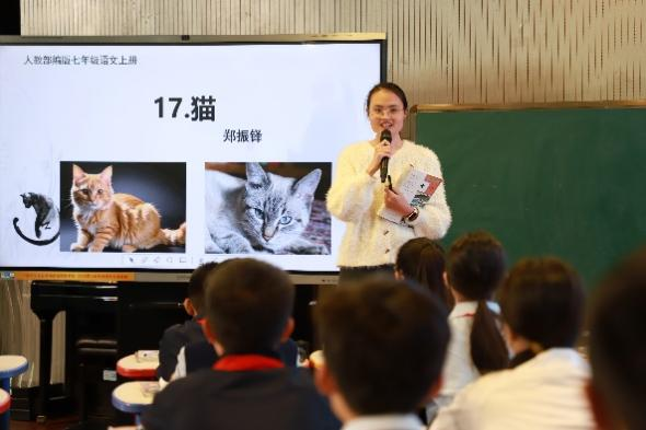在随后开展的教学示范环节中,浙师大实习教师张怿渊执教《猫》一课,以“案情侦查”为情境主线,引导学生深入文本,在梳理三只小猫命运的过程中探讨偏见与真相的深刻主题。滨海教育集团骨干教师翟跃则带来《故乡》示范课,以“碗碟失窃案”为切入点,通过分组研讨与对比分析,引导学生剖析人物形象,理解作品的时代内涵,展现出扎实的教学功底。