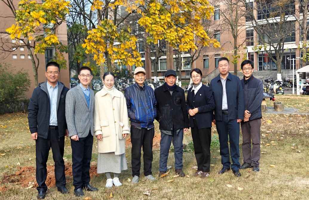 2025年12月12日上午,浙江师范大学人文学院朴园内举行了一场简单而庄重的树木种植仪式。人文学院58级院友许汉云、黄学规先生委托邵介安先生作为代表,在母校70华诞之际,向学院捐赠七棵金丝楠木树苗,寓意七秩峥嵘、根基长青。校发展联络办公室主任周红霞,人文学院党委书记吴洪涛、党委副书记陈海峰,后勤服务中心副主任倪利江,以及3位院友当年的授业恩师周舸岷,与师生代表共同参与了此次植树活动。