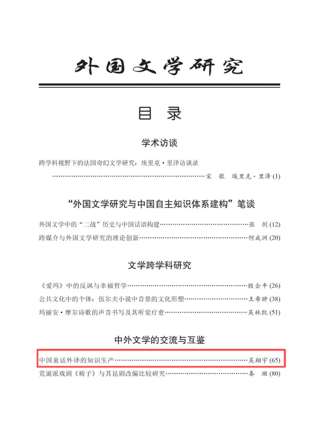 近日,我院儿童文学学科的吴翔宇教授在《外国文学研究》2025年第6期上发表论文《中国童话外译的知识生产》,该文系国家社科基金重大项目“百年中国文学视域下儿童文学发展史”的阶段性成果。