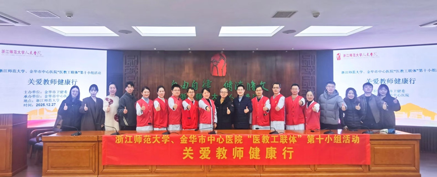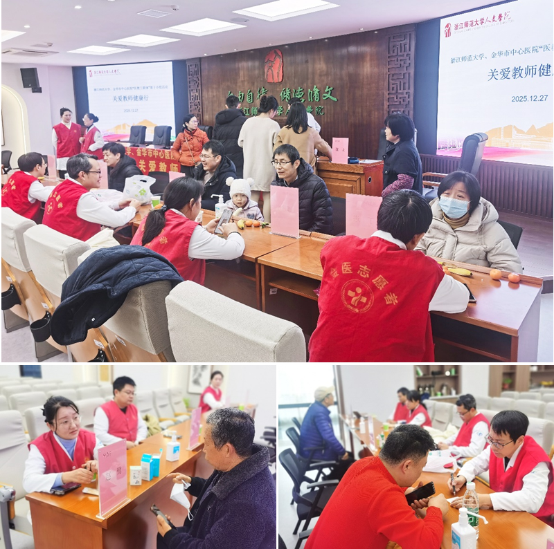 12月27日上午,浙师大人文学院北山厅内暖意融融,由人文学院工会发起,浙师大与金华市中心医院联合举办的“医教工联体”第十小组义诊活动在此隆重举行。金华市中心医院主任医师丁进率领来自中心医院消化内科、神经内科、感染科等7个科室的9位医护专家,为浙师大50名教职工提供了健康咨询与诊疗服务,以实际行动践行“关爱教师健康行”的理念,为师大老师们送上冬日关怀。