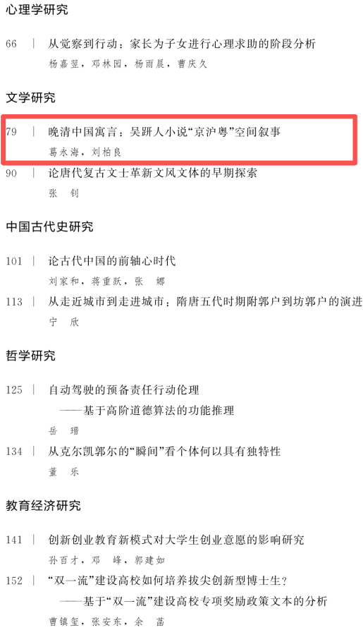 近日,人文学院古代文学学科的葛永海教授在《北京师范大学学报(社会科学版)》2026年第1期上发表论文《晚清中国寓言:吴趼人小说“京沪粤”空间叙事》,该文系国家社会科学基金重点项目“游士叙事视角下的明清小说地图研究”(19AZW014)的阶段性成果。