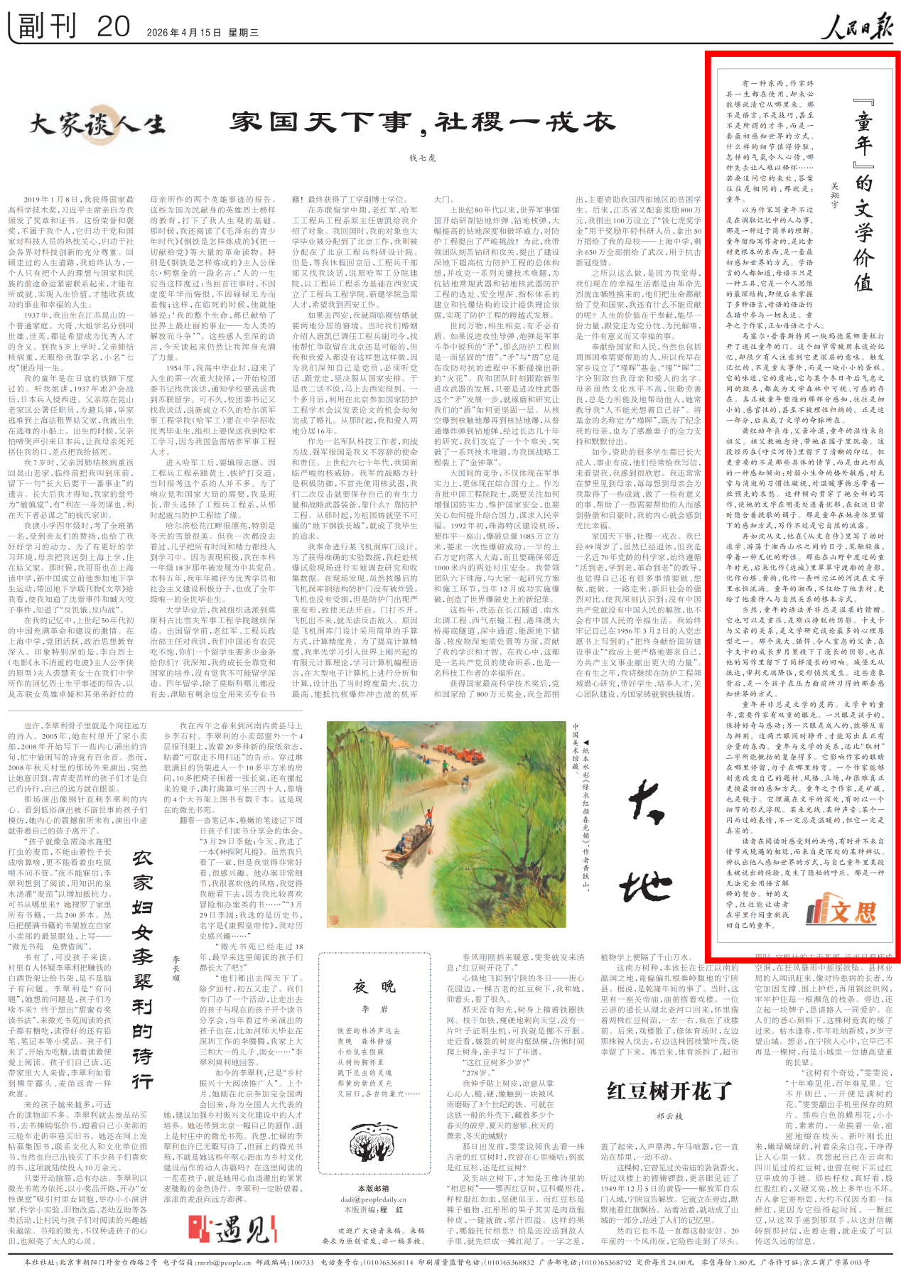 4月15日,人文学院吴翔宇教授在《人民日报》(2026年04月15日20版)发表题为《“童年”的文学价值》的文章。